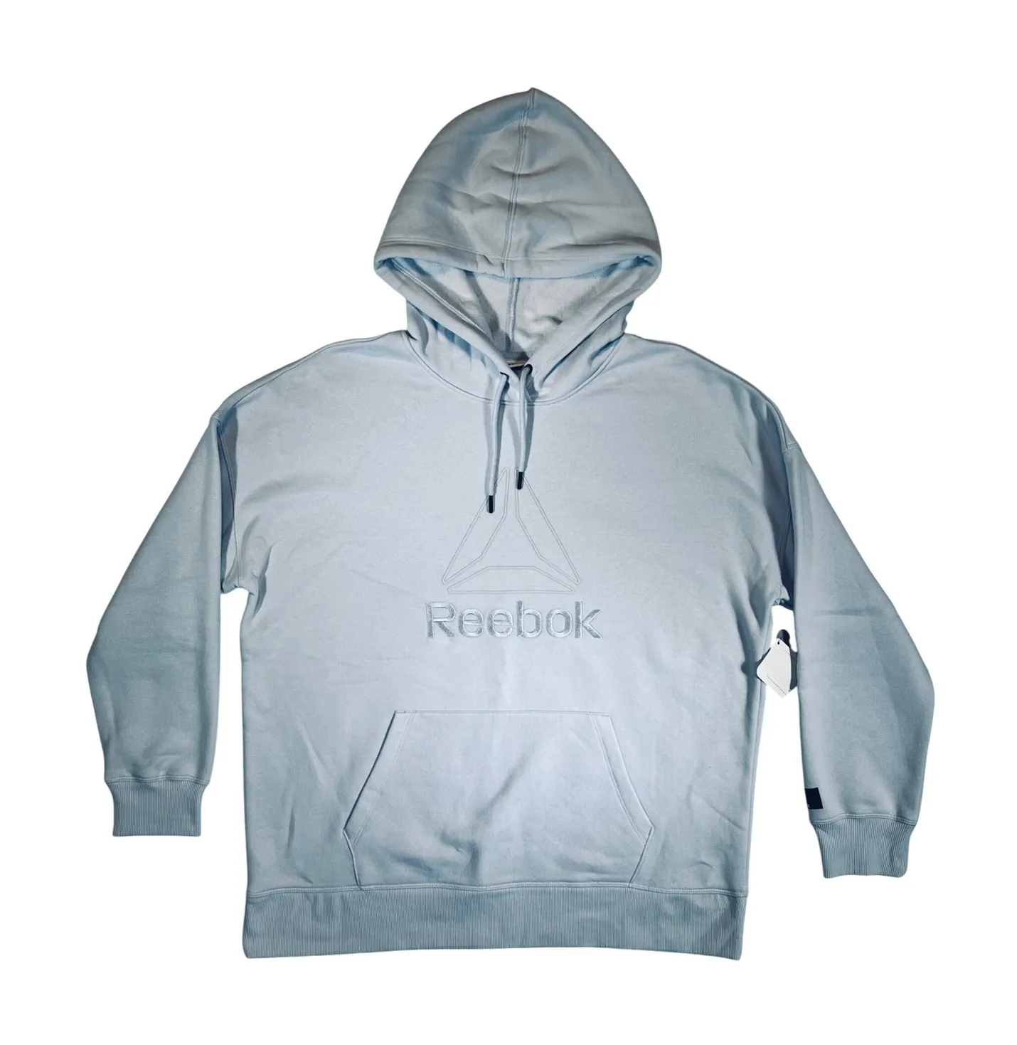 Reebok women's light blue relaxed fit hoodie sweatshirt. Features a classic pullover design with a d... Show more