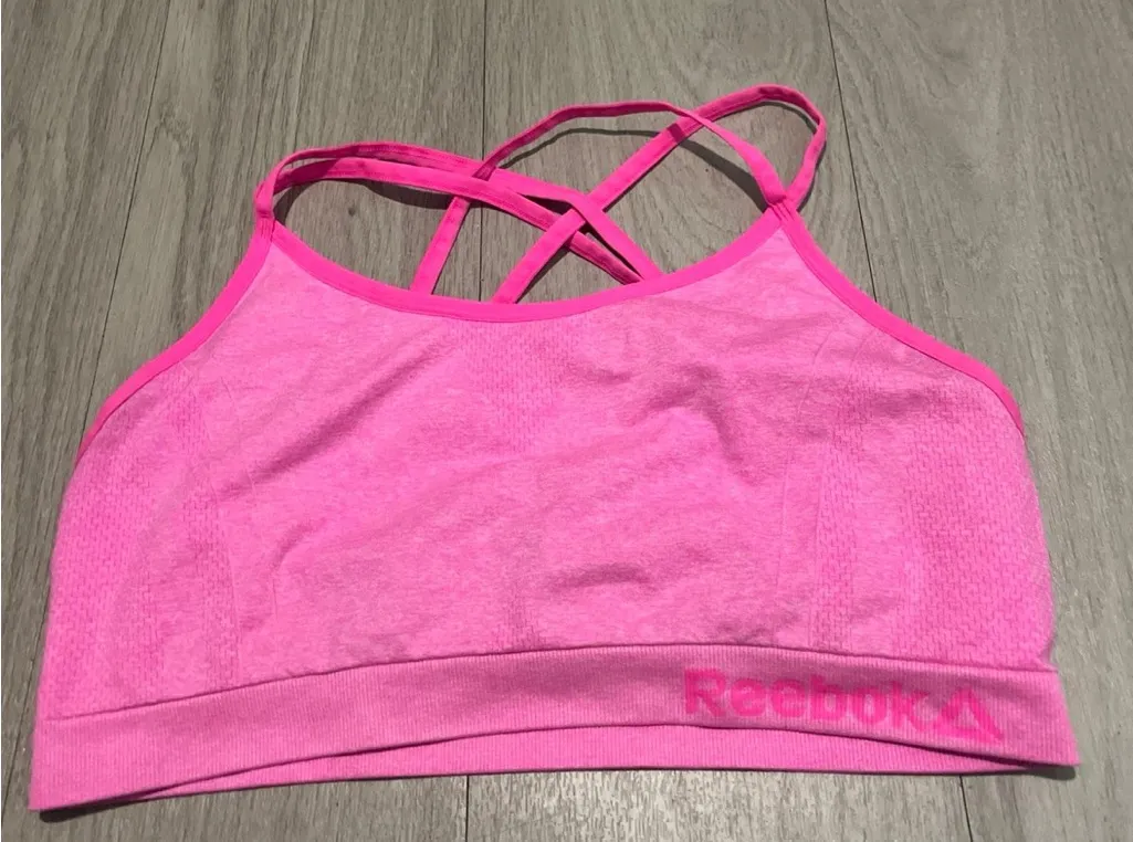 Bright pink sports bra with stylish strappy back. Ideal for active wear. Offers comfort and support.... Show more