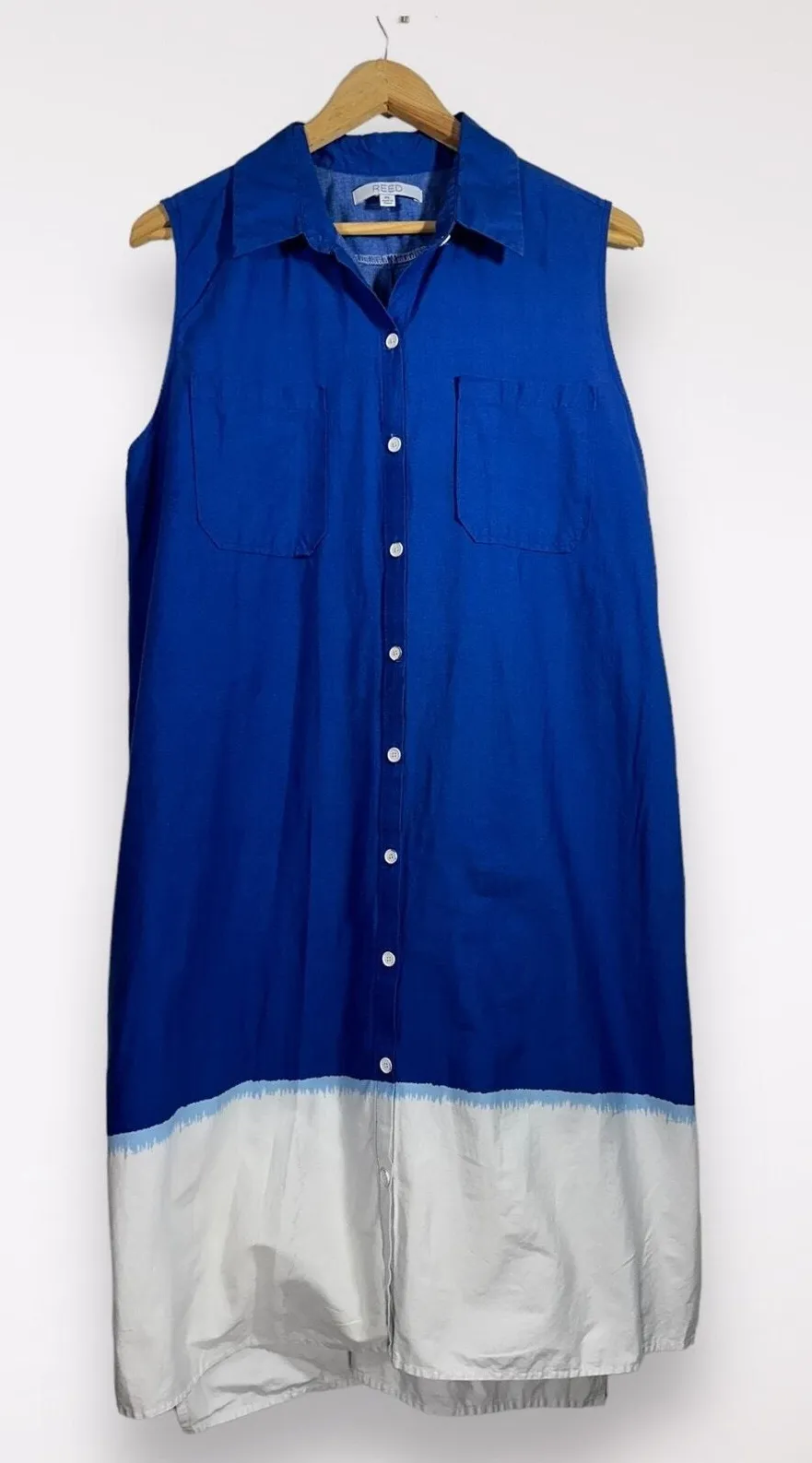 Reed Krakoff Dress Women's Size XL Dip Dye Sleeveless Shirt Dress Blue & White BRAND Reed Krakoff CONDITION Excellent preowned, gently worn condition. No flaws outside of light normal wear. SIZE tagged size Women's XL Measurements are approximate (inches): 15 shoulder 8.5 arm opening 40 length 20 pit to pit 23 waist NOTES With an artistic dip-dyed design and high-low hem, this women's REED shirtdress gives you a cool and casual look with modern details. Limited edition Dip-dyed hem Vented high-low hem 4-pocket Button front Sleeveless Unlined Side on-seam pockets Grosgrain sash/belt loops Knee-length Machine wash 98 cotton 2 spandex TAGS Dyed, Luxury, Designer, Work, Shirt Dress, Sleeveless, Blue, Casual, Cotton, Everyday, Soft