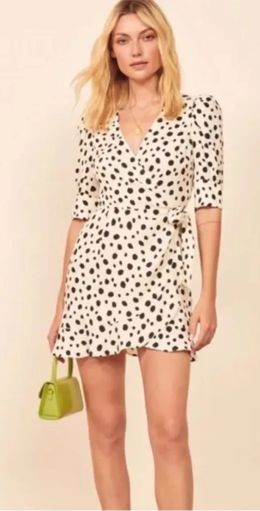 Reformation Dress Reformation Deanna true wrap dress in white with black asymmetrical black dots.... Show more