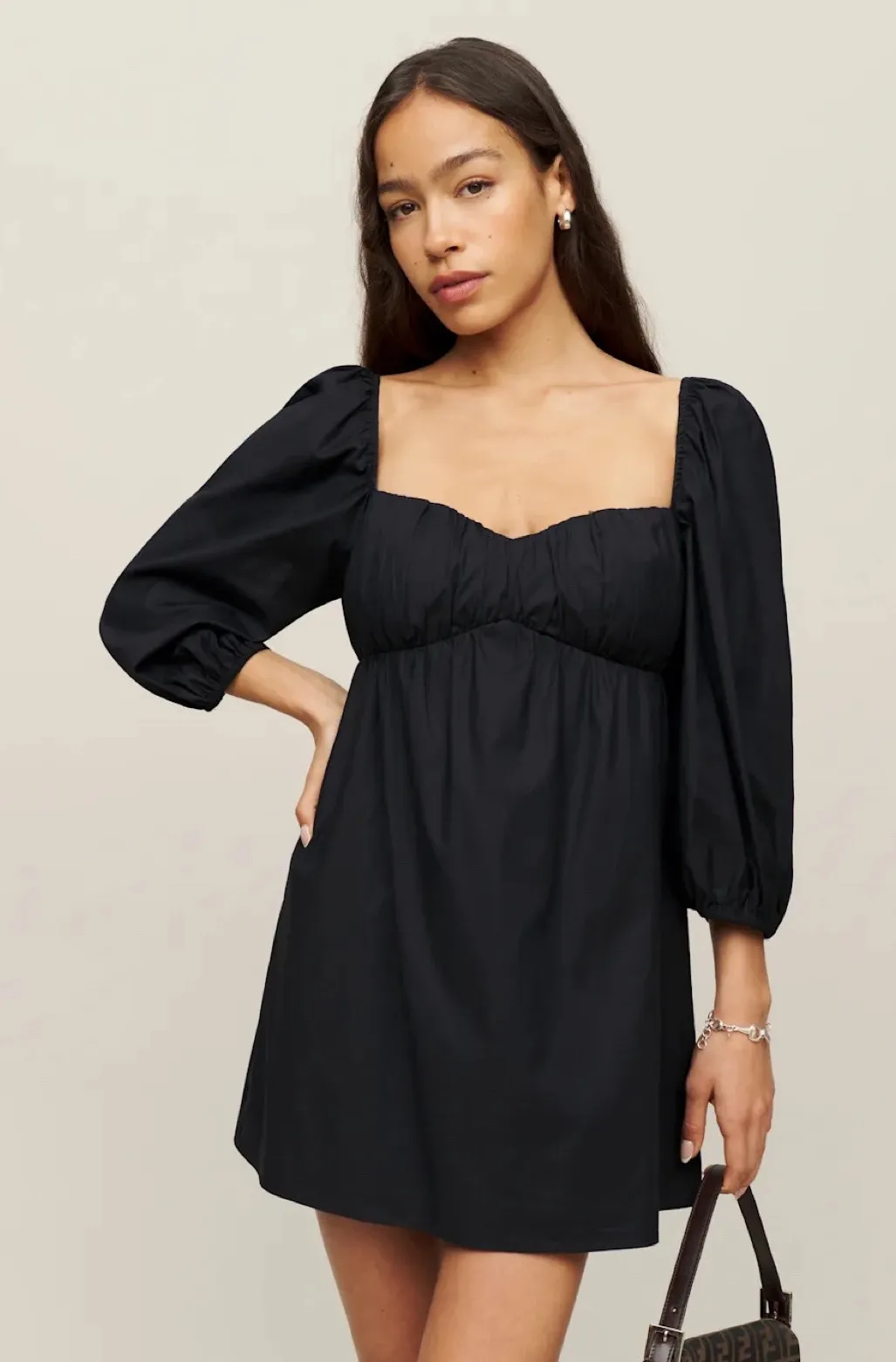 Style Name: Reformation Farley Dress Print: Black Features: Mini length babydoll silhouette, ruched... Show more