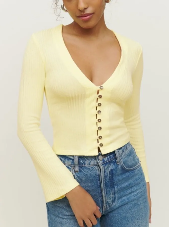 Size small, excellent condition The Reformation Gellar Knit Top is a waist-length style with a V n... Show more