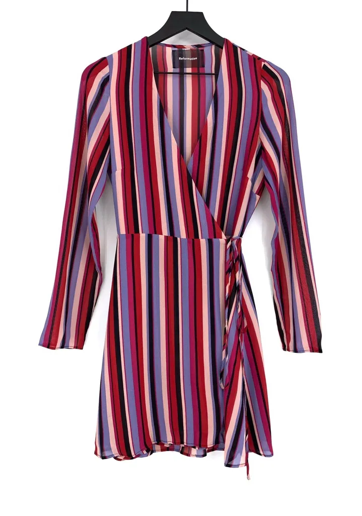 Reformation Gjelina Luisa Striped V Neck Wrap Mini Dress in pink, purple, black, and cream stripes.... Show more