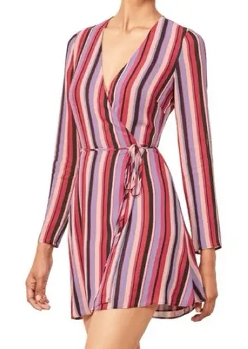 Style Tags: feminine, wrap silhouette, mini length, long sleeve dress, reformation style, striped pattern, multicolor palette, pink and red tones, sustainable fashion, lightweight fabric, flattering fit, waist tie, casual chic, date-night ready, brunch outfit, summer style, transitional wear, wardrobe staple, timeless design, playful vibe, bold color combo, effortless look, trendy piece, soft drape, everyday wearable, elevated casual, modern boho, eco conscious, flirty aesthetic, statement stripes