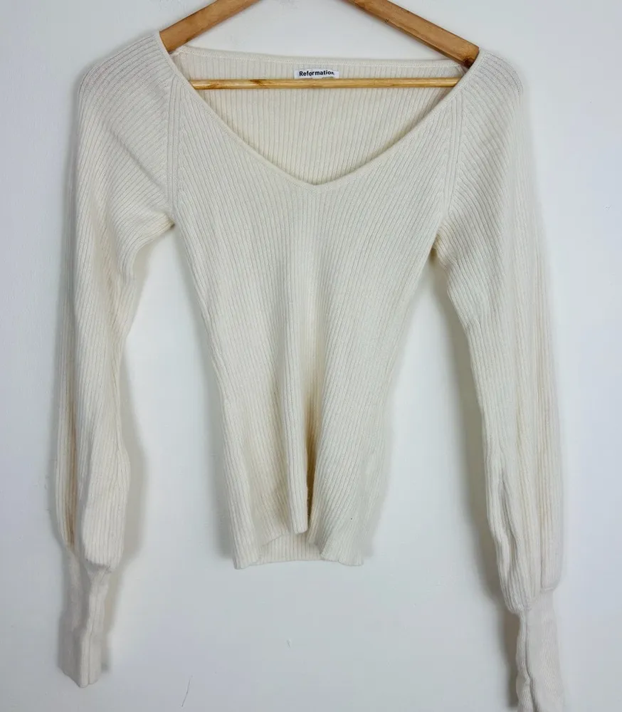 Reformation cream/white cashmere sweater. “Hart” v-neck sweater. Balloon cuffed sleeve. Size small.