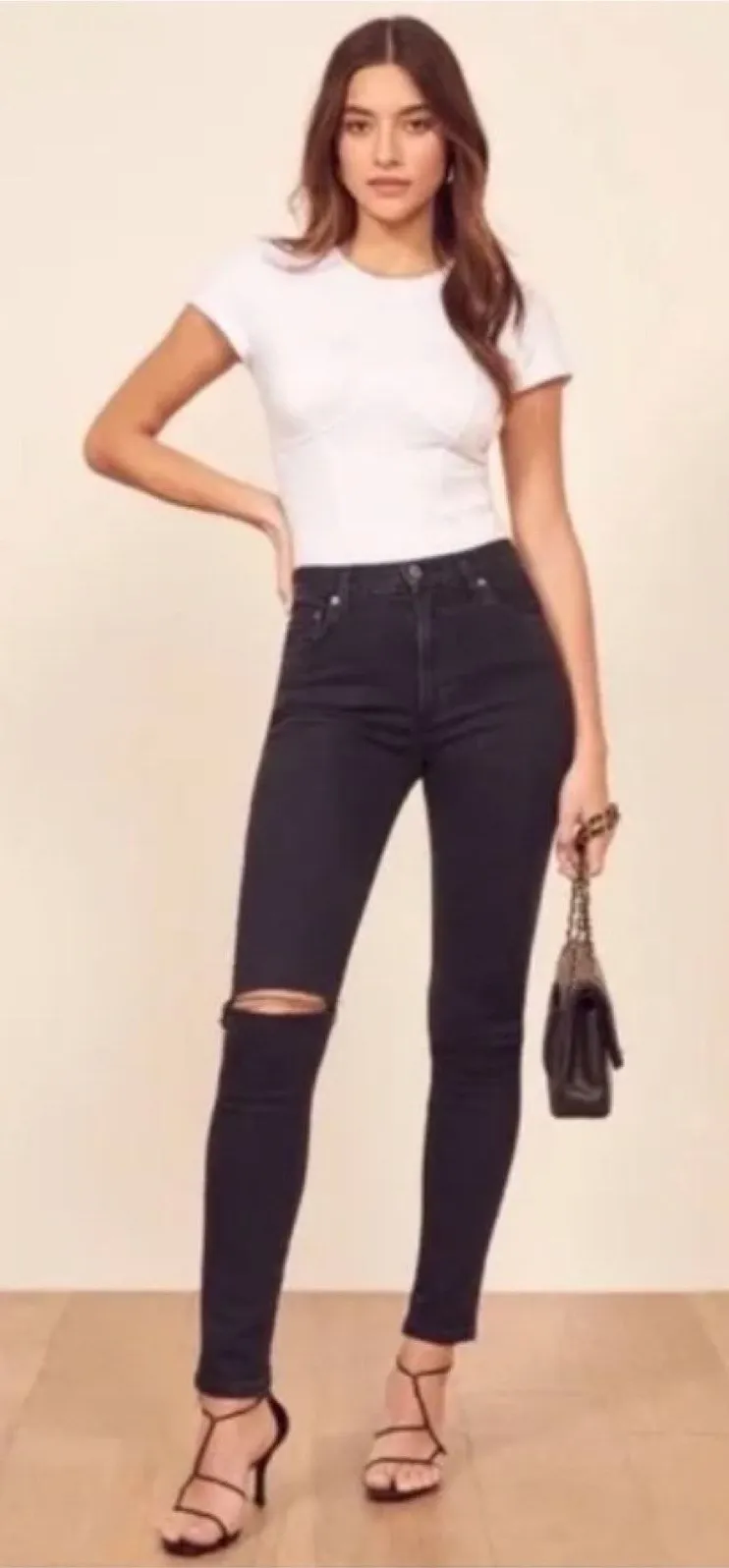 Reformation High Waist Skinny Jeans in Faded Black Destroyed Wash Need a bit of a break from your... Show more
