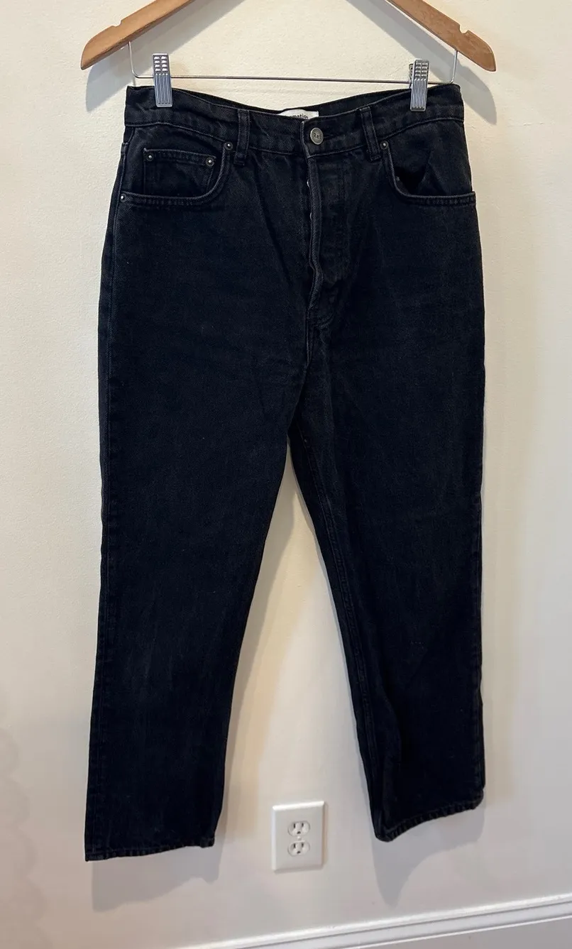 Reformation black high-waisted straight leg denim jeans. These pants offer a classic and versatile s... Show more