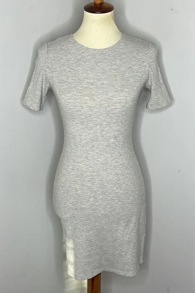 Reformation closet staple: Gray bodycon dress, size small Ribbed with short sleeves and a round neck... Show more