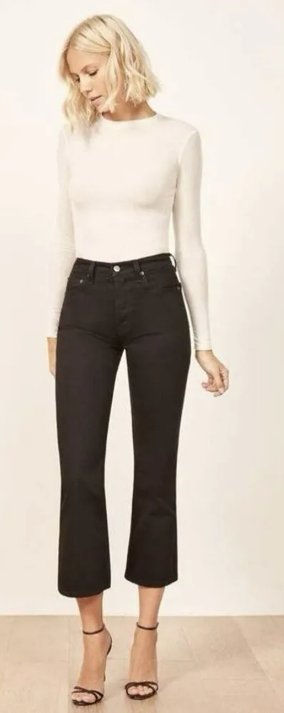 The product is a pair of Reformation Jordi Kick Flare jeans in black, size 23, with a mid-rise and c... Show more