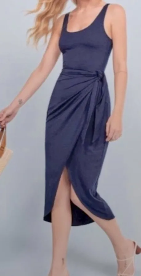 Reformation Kaila Knit Dress in classic navy blue. This piece features a scoop neckline, fitted bodi... Show more