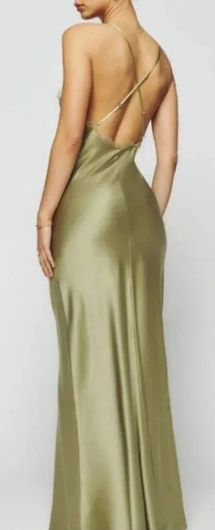 Reformation Maysen Silk Formal Maxi Dress in Olive Oil Green. Size 10. Features charmeuse fabric, lo... Show more