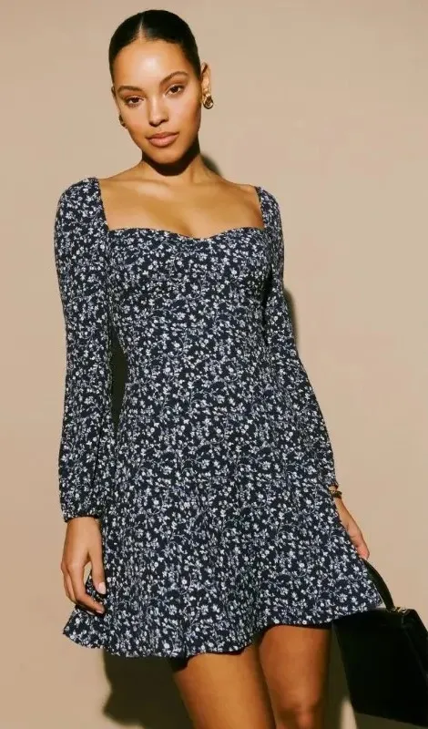 A long-sleeve mini dress with a sweetheart neckline and puff sleeves. Designed to be fitted at bodic... Show more