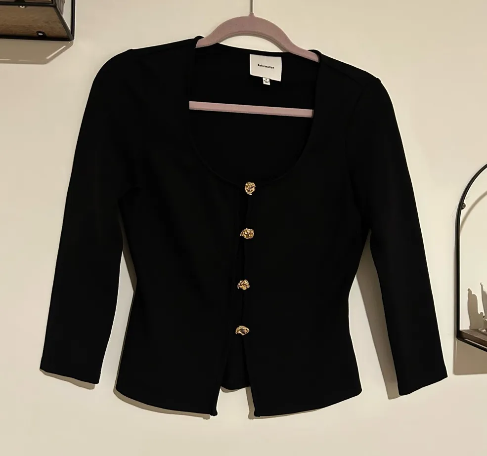 Reformation Owen Knit Top Black Gold Button 3/4 Sleeve Blouse Size Small Measurements (approximat... Show more