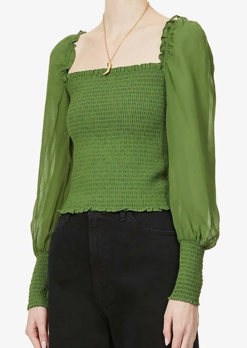 Green smocked square neck top with long puff sleeves. This top features a shirred bodice that extend... Show more