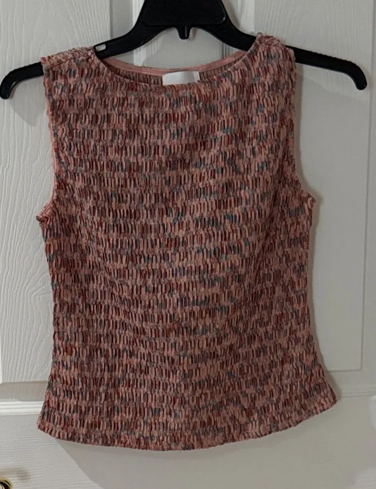 Chic sleeveless blouse with a textured design. Features a blend of pink and gray tones. Ideal for ve... Show more