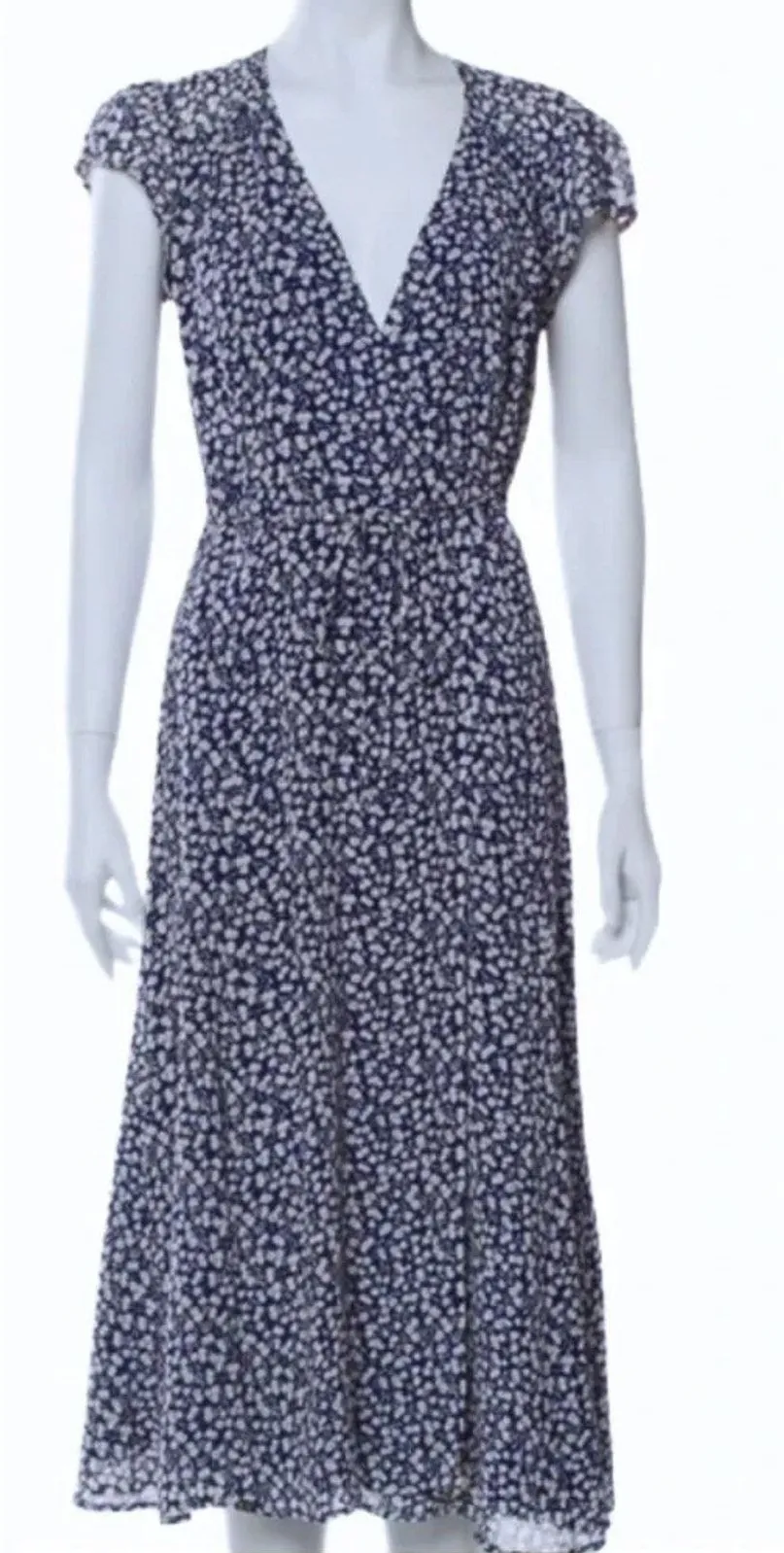 REFORMATION Women’s Blue and White Mini Floral Print Full Wrap Midi Dress Lined bust and skirt Shor... Show more