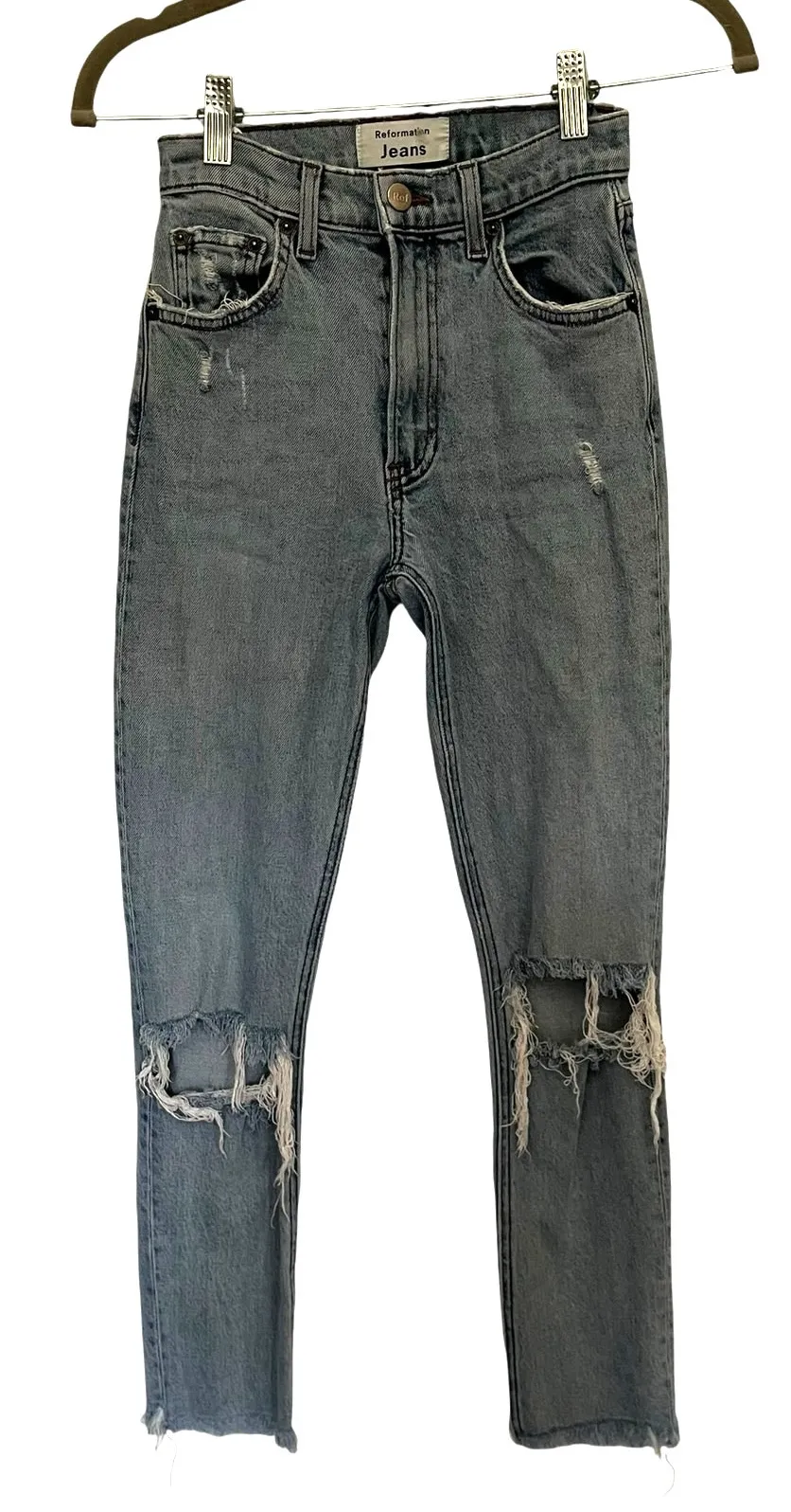 Light wash Reformation High and Skinny Distressed Stretchy Miami Destroyed Jeans Distressed with holes in knees and cut off frayed hems, Made in USA Button and zip closure, 5 pockets Pre-owned condition, please see photos Size 23 66% Lyocell 32% Cotton 2% Recycled Elastane Approximate measurements in inches: Waist (laid flat): 11 Rise: 10 Inseam: 26 Leg opening: 5 Reformation Jeans, high rise, distressed denim, ripped knees, raw hem, skinny jeans, ankle length, eco friendly denim, sustainable fashion, soft vintage wash, Reformation Los Angeles, light wash jeans, minimal, everyday casual, California cool, clean girl, model off duty, capsule wardrobe, classic fit, streetwear chic, effortless style, slow fashion, neutral aesthetic, Y2K revival, grunge light, pared down basics, modern eco denim, summer to fall transitional