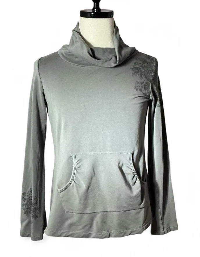 REI cowl neck long sleeve tunic top in gray. Features a kangaroo pocket with decorative stitching an... Show more