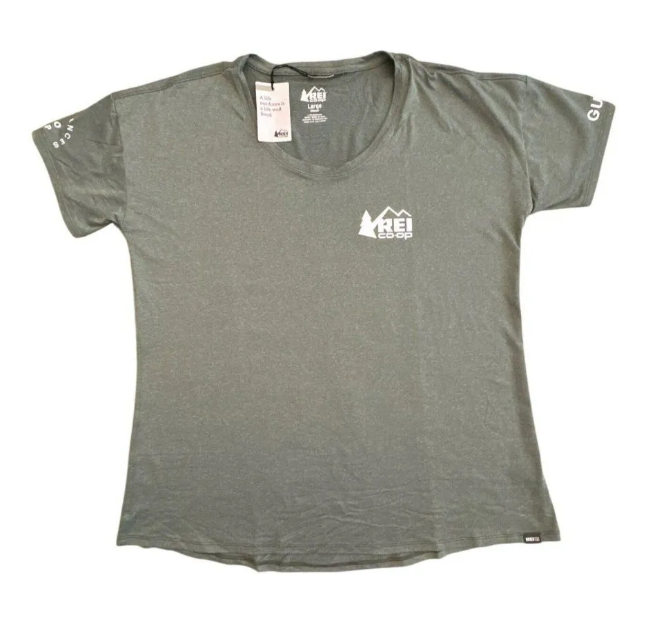This women's REI Co-Op Guide Sahara short sleeve crew t-shirt, crafted in Green Arbor Heather, embodies a blend of functionality and style. Designed with a lightweight fabric, it offers comfort and breathability, making it a versatile choice for outdoor adventures or casual days. NWT new with tags **** Please note that there is a tiny pinhole at the neck on the back that is only visible if looking for it. From a security tag. Last photo • Short sleeve crew neck design • Green Arbor Heather color • Made with lightweight, breathable fabric • REI Co-Op logo on front and sleeve, other sleeve says Guide • Tag shows environmental sustainability commitment APPROX measurements • Top to bottom = 25 inches • Armpit to armpit = 21 inches Gorpcore UPF 30+ Moisture Wicking Quick-Dry Granola Girl Athleisure Travel Ready Camping Backpacking Summer Trains Size: L