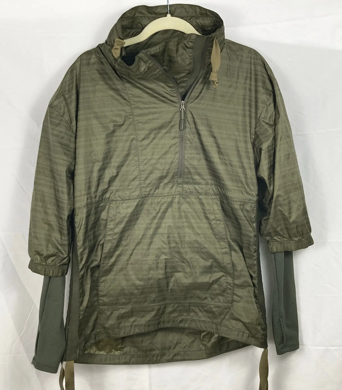 Good gently used condition, with a few darkened spots at left chest and right shoulder (see pics for additional details). Style tags: running, hiking, camping, trail, windbreaker, anorak Please check measurements against an item you currently own! Flat measurements (approximate) Length: 26" Pit-to-pit: 19.25" Sleeve: 24" Smoke-free, pet-friendly home. Items are steamed before storage.