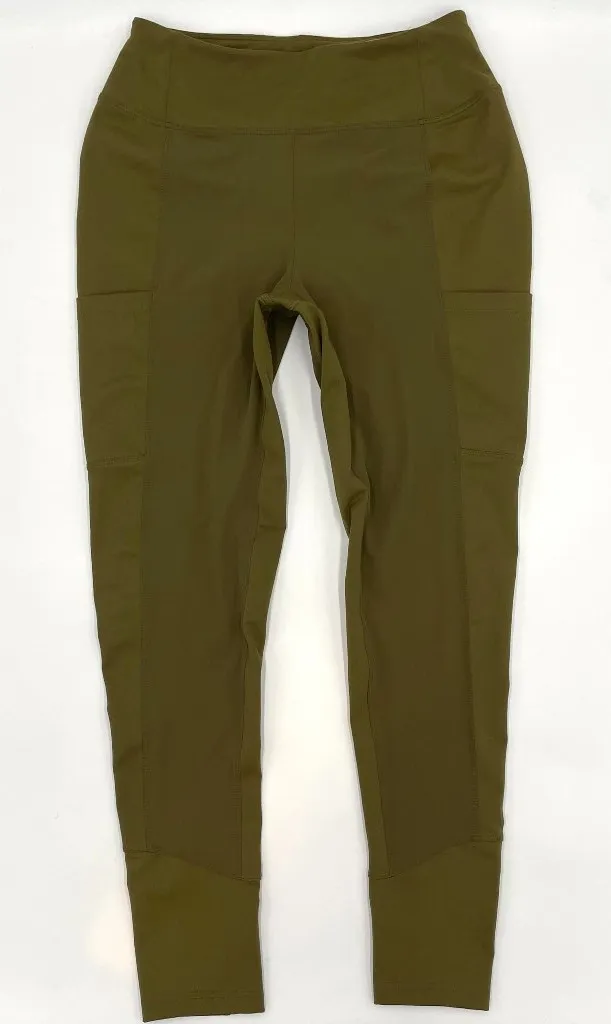 REI women's olive green leggings with a pocket in the waistband and on each side. Condition: Gently preloved with a small popped stitch in the waistband pocket. No holes or stains. Size: XS. See approximate flat measurements for best fit. Across waist: 12.5" Front rise: 9" Back rise: 15.5" Inseam: 27" Cleaned and from a smoke-free home. Fast shipper!