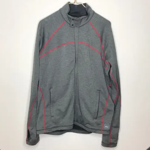 REI Mens Zip Athletic Jacket Gray with Red Trim Size Large L Shoulder to shoulder - 19 in Shoulder to bottom - 28 in Sleeve - 20 in Two hip pockets No flaws to note 94% Polyester, 6% Spandex