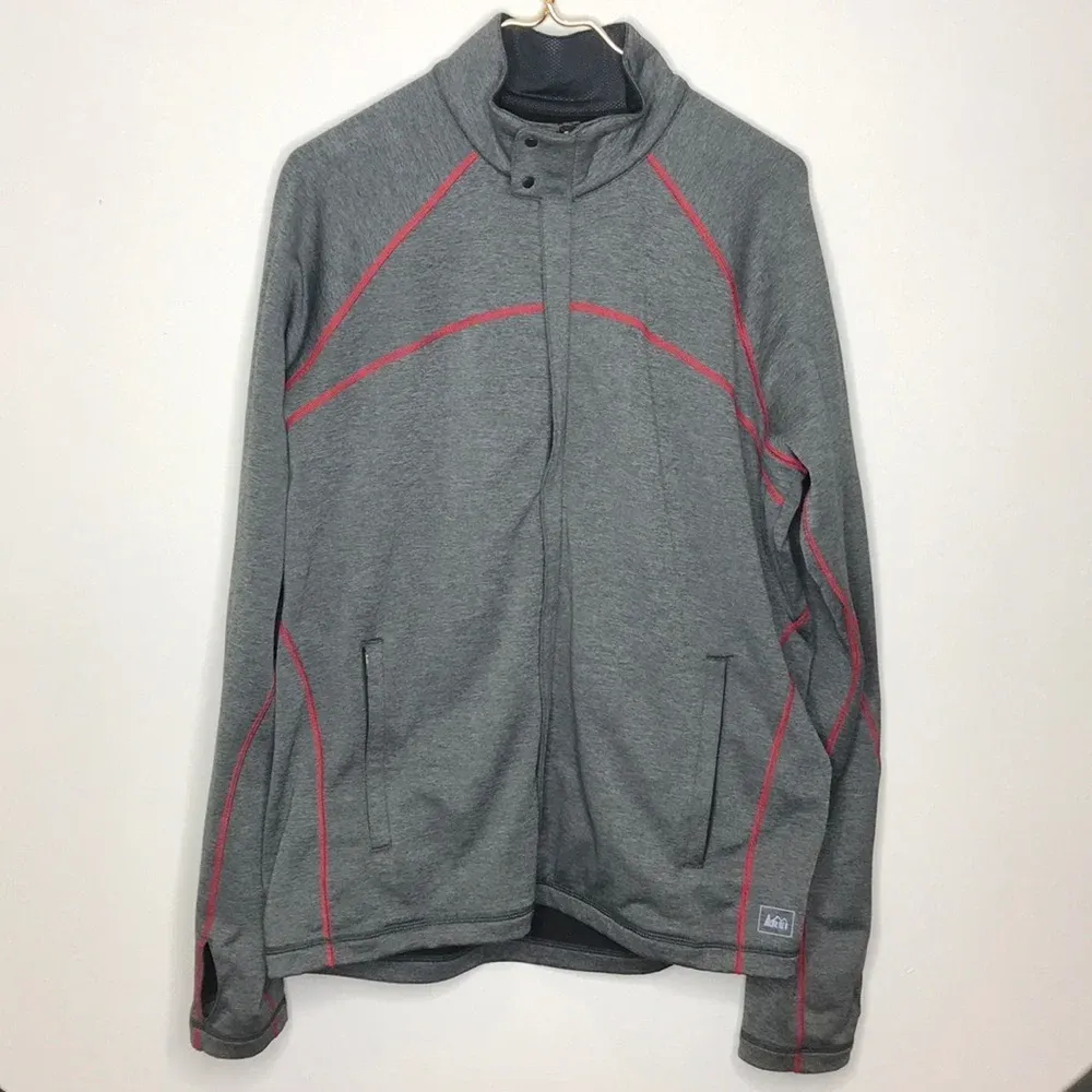 REI Mens Zip Athletic Jacket Gray with Red Trim Size Large L Shoulder to shoulder - 19 in Shoulde... Show more