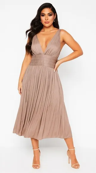 REISS Taupe V Neck Pleated Midi Dress - Back strap loose threads, can be wore as is or add a few stitches! Measurements Laying Flat!! Size • 8 Armpit to Armpit • 15" Waist • 15" Hip • 18" Length • 50" 825-B A elegant REISS taupe midi dress designed with a flattering V neckline and a smocked empire waist. The skirt features graceful pleats that create beautiful movement. This dress is perfect for a wedding guest ensemble, an evening out, or a sophisticated cocktail party. Style: Fit & Flare, Sundress Dress Length: Midi Department: Women Sleeve Length: Sleeveless Pattern: Solid Occasion: Party/Cocktail, Formal Material: Rayon Fabric Type: Woven Neckline: V-Neck Unit Type: Unit Keywords: REISS dress, taupe dress, V neck dress, midi dress, pleated dress, smocked waist, elegant dress, evening dress, cocktail dress, wedding guest dress, special occasion dress, sophisticated, chic, feminine