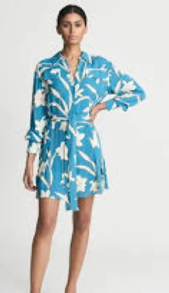 Reiss Tida Shirt Dress Size US 6 Teal Blue with cream Floral Belted with fabric loops on each side Pleat details on bottom hem but no slits Excellent condition! Like new. Only thing I saw was a teeny bit of stress on one of the pleats see last photo Long Sleeve 100% viscose Length approx 34.5” as hung with belt slightly cinched Lunch Brunch Casual Flaps on chest are for show, no pockets I ship fast