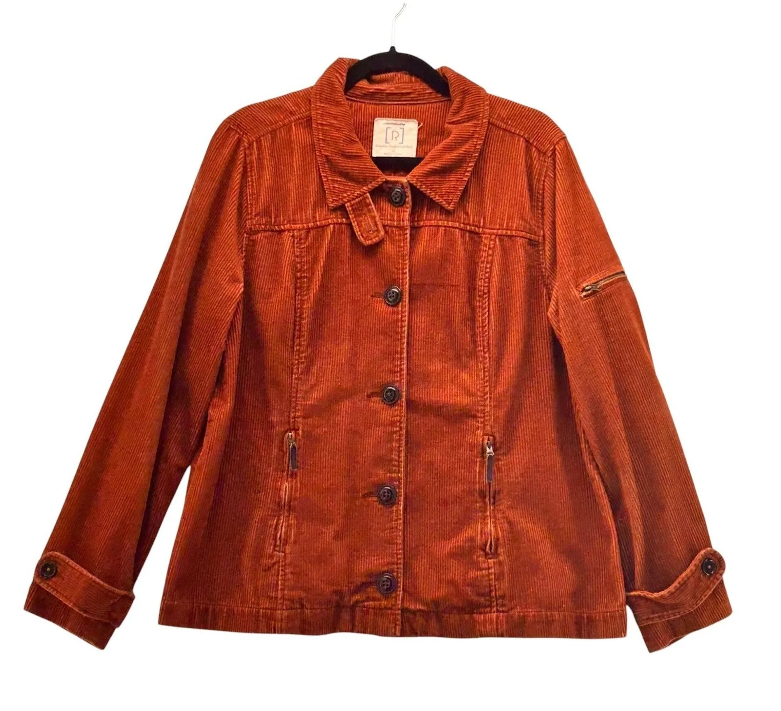 Embrace cozy chic with this Relativity corduroy jacket in a warm burnt sienna hue. Designed with a flattering swing style, this piece offers a relaxed yet polished silhouette. The textured corduroy fabric adds depth and visual interest, while the practical zipper pockets provide convenient storage. Buttons down the front allow for adjustable styling, and the cuffs feature button closures for a tailored finish. This versatile jacket is perfect for autumn strolls, casual weekend outings, or adding a touch of retro flair to your everyday look. There's some signs of wear, please review pics. Measurements: • Pit to Pit: 22.5 in • Length: 26.5 in Type: Jacket Style: Swing Jacket Color: Burnt Sienna Department: Women Accents: Button, Zipper Features: Pockets Fabric Type: Corduroy Pattern: Solid Season: Fall, Spring Closure: Button, Zip Occasion: Casual Sleeve Length: Long Sleeve Please contact me with questions. Item is from a smoke-free, dog-friendly home, laundered using a fresh-scent fabric softener. We use Dryel for dry clean only. Check measurements. 1 business day handling