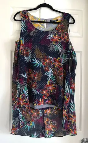 Beautiful blue floral print sleeveless blouse by Relativity, size XL. Features a flattering hi-low h... Show more