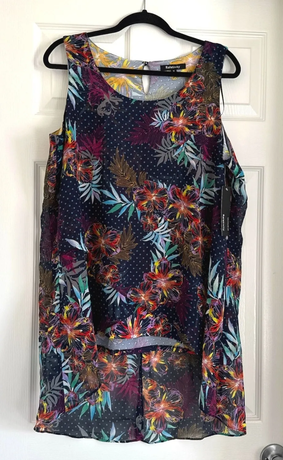 Beautiful blue floral print sleeveless blouse by Relativity, size XL. Features a flattering hi-low hemline, lightweight fabric, and is brand new with tags. Measurements: • Length: 36 in (back), 28 in (front) • Pit to pit: 23 in Color: Blue Type: Blouse Department: Women Style: Tunic Material: Polyester, Spandex, Polyester Blend Neckline: Round Neck Sleeve Length: Sleeveless Sleeve Type: Sleeveless Pattern: Floral Features: Hi-Low Hem, Lightweight, Breathable, Split Hem Fit: Regular Relativity, Women's Top, Sleeveless, Floral Print, Hi-Low Top, Blouse, Island Escape, XL, Bohemian, Casual, Summer, Spring, Party Top
