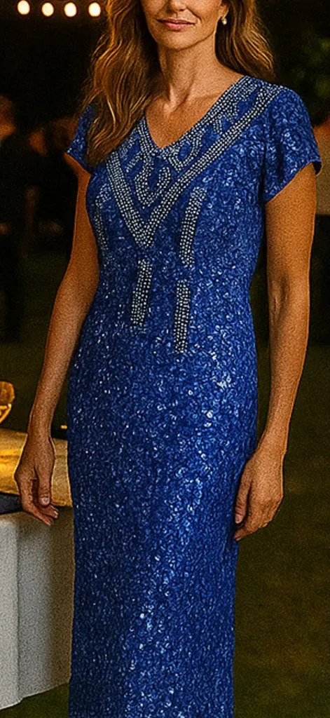 Great condition with no major signs of wear. Some beads are missing around neckline, shown. A few may be missing or loose, but no major wear. I couldn’t find any other missing or loose beads. Stunning vintage fully beaded and sequined gown. Formal dress by Relin. Size L. Short sleeved. Sleeves have gorgeous beaded detailing. 100% silk. Lines of beads details on front. Full length. Slit in back. Measurements lying flat, unstretched, approx: Bust 21” Waist 17.75” Hips 21” Length 55-56”