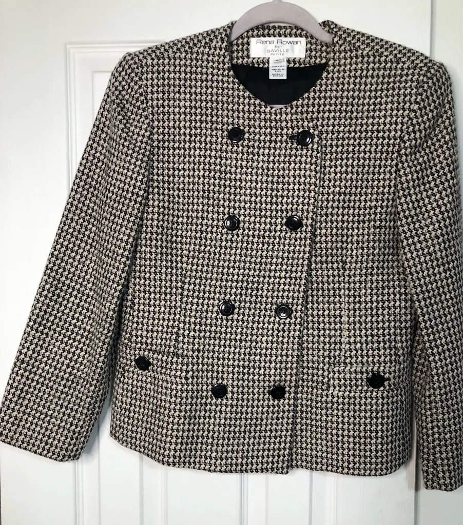 Rena Rowan for sayville petite. Wool blend. Preowned in good used condition. Size 8P Made in USA Pit to pit 17” across Length 23” Pink black white 8 button front 4 buttons button Two front pockets Perfect for business casual workwear office. Evening out. Event secretarycore SKU CC