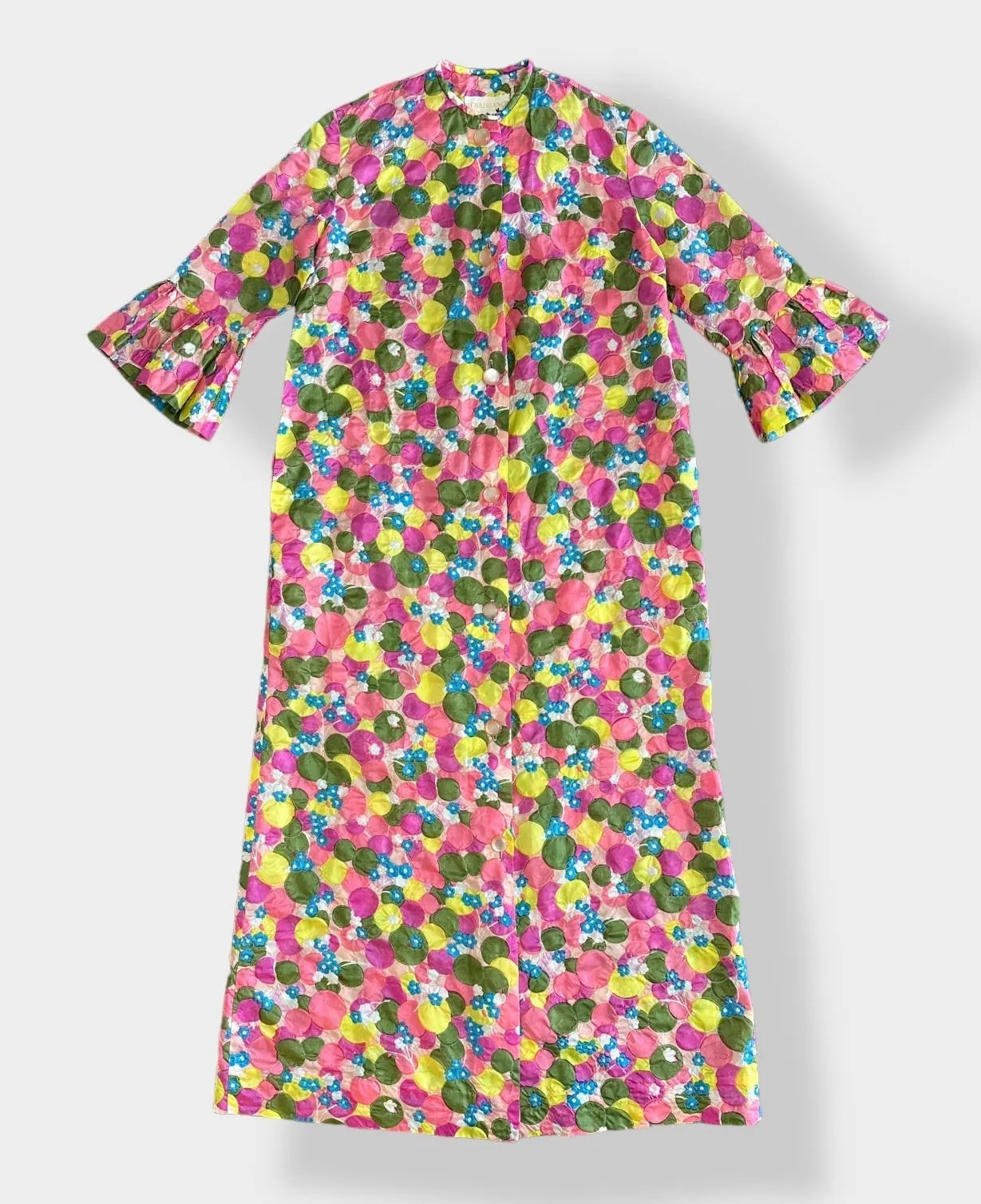 -Renaissance 1960's Retro Union Made Multicolored button front dress, with textured fabric, bubblegum buttons, flared half sleeves. -Size Medium -100% Polyester -Made in USA -Preowned and Vintage in Great condition. Tag has name written on it but it doesnt affect the integrity of the dress. Vintage, union made, 60's, retro, 1960's, long dress, spring, light weight, going out, event, fun, funky, colorful, lightweight