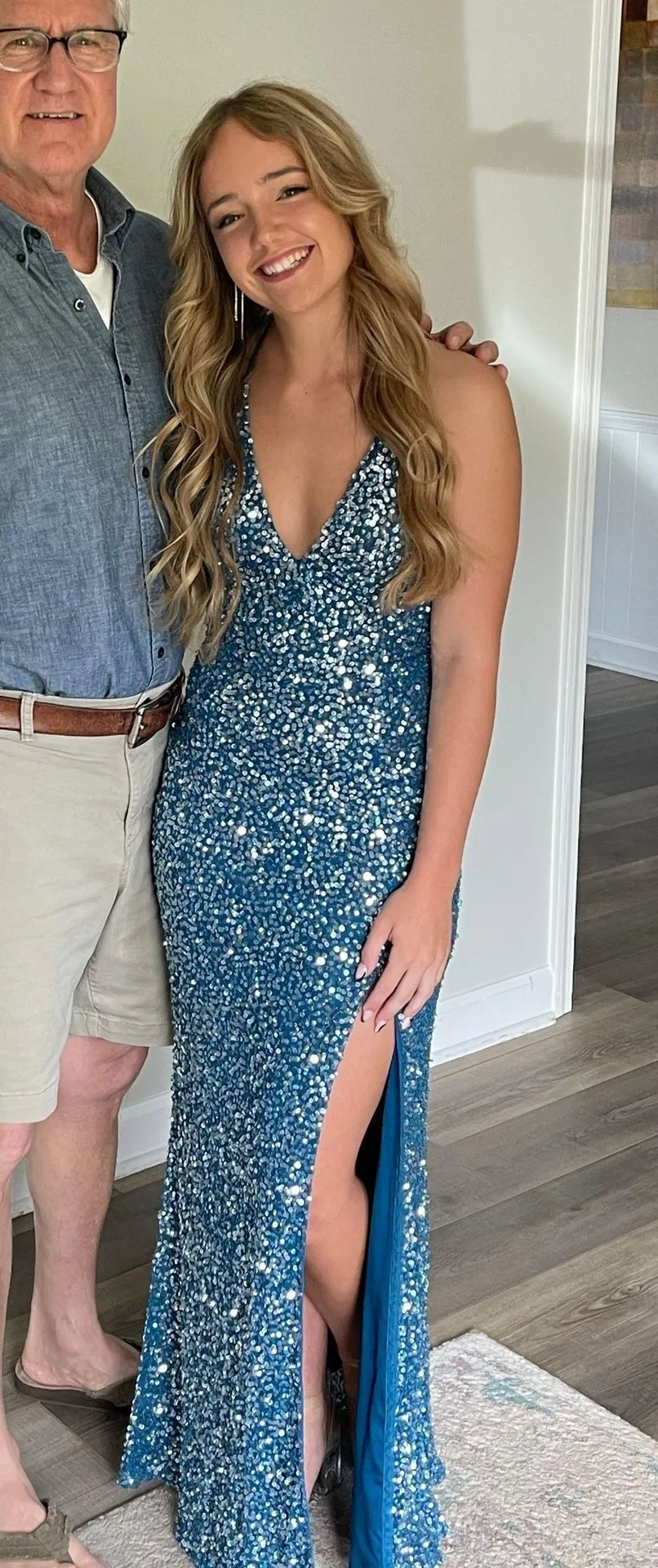 Blue backless prom dress with slit and v neck line. Only worn once for 4 hours, a few sequins missing right under the armpit (picture provided) absolutely gorgeous dress and fit very nicely. If you have any questions feel free to reach out
