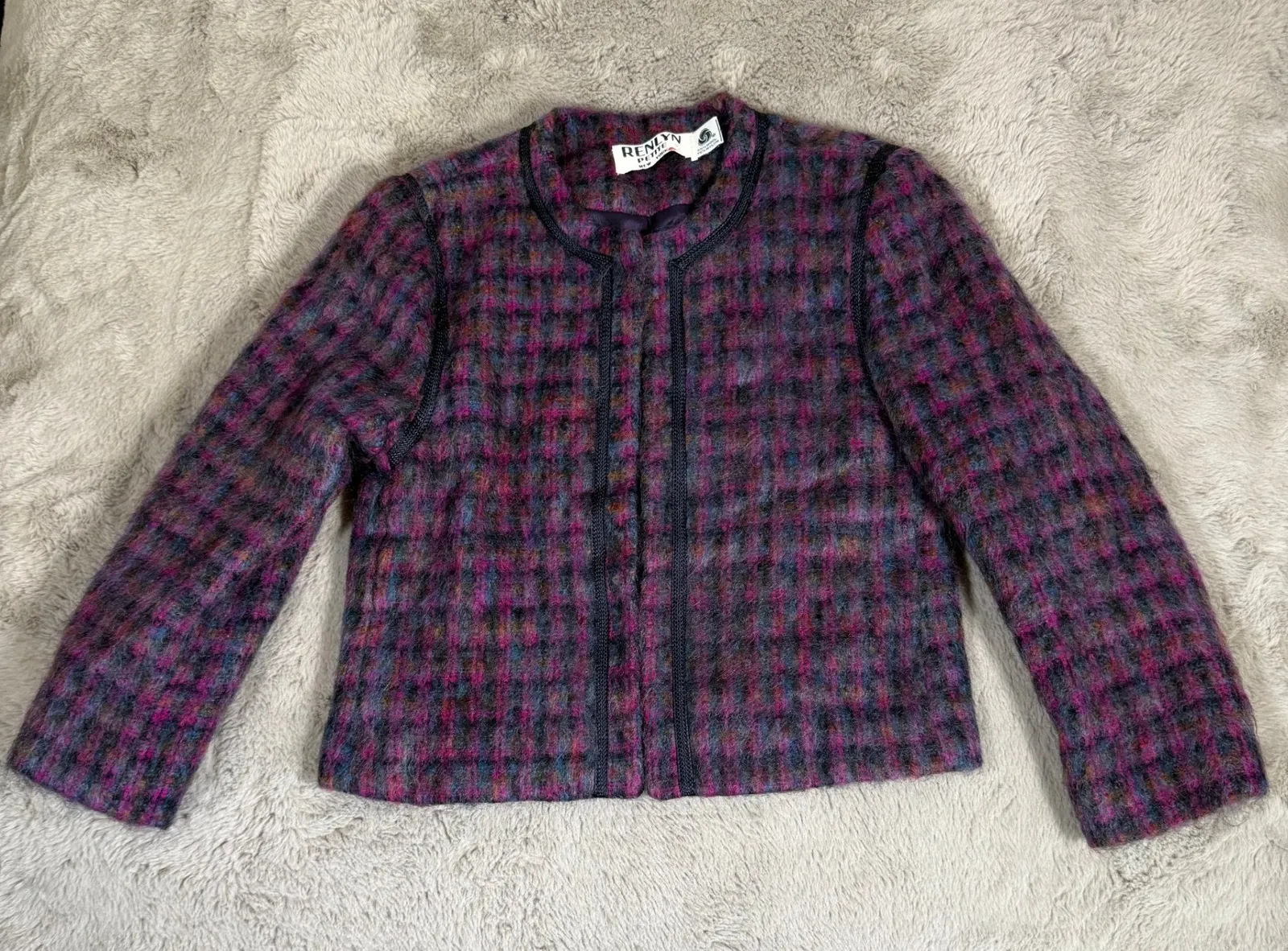 Elevated style awaits with this Renlyn Petite jacket, a sophisticated statement piece that exudes timeless charm. The jacket features a captivating plaid pattern in shades of purple, pink, and gray, offering a unique visual texture. Its collarless design and subtle black trim create a sleek, modern silhouette, while the quality construction ensures a comfortable and flattering fit. The jacket is fully lined with a luxurious purple fabric, adding an extra touch of elegance. Perfect for adding a touch of sophistication to your office attire or elevating a casual weekend look, this jacket is a versatile addition to any wardrobe. Type: Jacket Outer Shell Material: Wool Blend Style: Basic Jacket Department: Women Color: Purple Lining Material: Nylon Features: Lined, Collarless, Lightweight, Retro, Made in USA Fabric Type: Tweed Pattern: Plaid Jacket/Coat Length: Short Insulation Material: Wool Season: Fall, Winter, Spring Keywords: Renlyn Petite, plaid jacket, wool jacket, petite jacket, size 8, vintage jacket, career jacket, purple jacket, wool blend, made in USA, retro jacket, collarless jacket, blazer, womens jacket