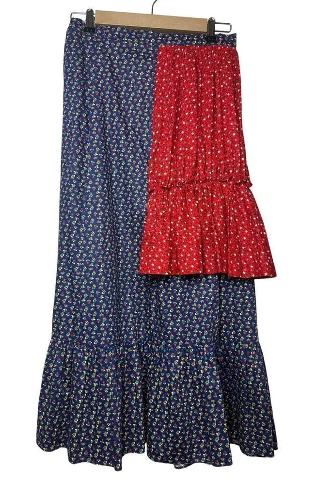 Rentrayage Floral Tiered Cotton Skirt Sz. XS Approximate Retail $1050 Excellent condition! This is a one of a kind piece made exclusively from recylced materials. Reworked in NYC. Rentrayage was born out of the concept of reimagining and reanimating what has already existed; creating beauty and value, new shape, new form, new style from what has been discarded. Measures: 34"L,14" waist (flat)--has elastic Dry clean or hand wash