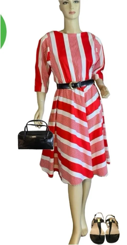 This listing is priced for the dress pictured only. REO Originals -vintage 1980's -red and white -chevron striped -3/4 length sleeve -pull over with single button at nape of neck -elastic waist -shoulder pads -dolman type top half with full skirt -approximately knee length depending on the individual -unlined -faux leather black belt included -fabric tag has been removed; feels like a cotton twill blend Dress no longer has a size tag; The size of medium is estimated based on measurements (32 inch bust) --please use measurements provided in photos for fit determination; Size tags alone, are not a reliable source. There are some light stains at the shoulder area and belt is flaking in areas. See photos. Preowned items (especially vintage pieces) are subject to any minor imperfections which come with an article of clothing that has been washed and worn; these signs of wear generally include light pilling or fuzzing, loose threading or wrinkling. Some listings may not include these issues, but as a general disclaimer, please be aware it is possible. Unless indicated, there is no major damage to a piece. To mitigate the cost of the items and avoid any issues customers may have with allergies, we leave desired cleaning to the new owners.