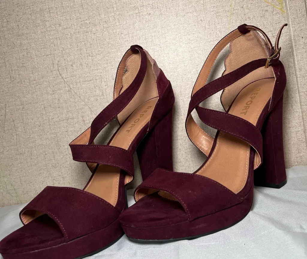 These sophisticated purple heels feature a soft suede texture and a delicate ankle strap with a gold-toned buckle, perfect for adding a touch of elegance to any outfit. Good condition size 9