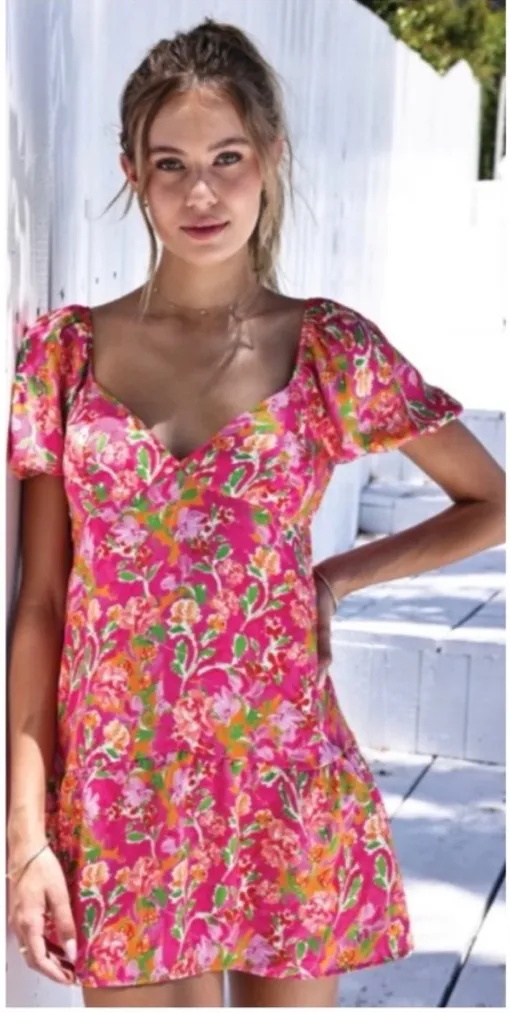 V Neckline With Fitted Bodice Short Puff Sleeves With Elastic Cuffs Empire Waist With Flowy Skirt Open Back With Adjustable Tie Closure Above Knee Length Pink Floral Print Lightweight Woven Fabric Unlined Excellent pre-owned condition resa dress, pink floral dress, puff sleeve mini dress, open back dress, boho mini dress, summer floral dress, resort dress, vacation dress, feminine mini dress, cottagecore dress