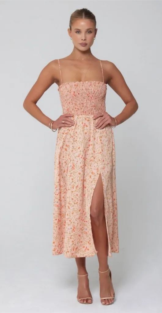 Resa Ashley midi dress in a soft sunstone floral print. Straight neckline with adjustable spaghetti straps. Smocked bust with a flattering, flexible fit. High leg slit with flowy midi length skirt. Lightweight woven fabric with allover floral pattern. Made in Los Angeles. 100% Polyester. Machine wash cold on delicate cycle. Air dry. Excellent pre-owned condition Resa ashley midi dress, resa floral dress, sunstone midi dress, smocked midi dress, spaghetti strap dress, floral slit dress, summer midi dress, resort wear dress, vacation dress, made in los angeles dress