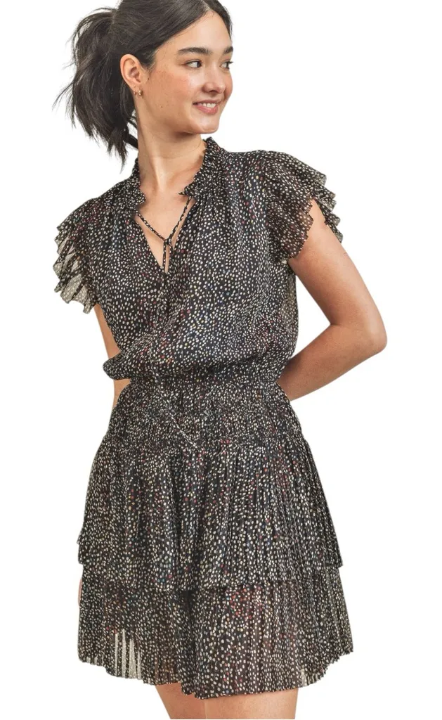 RESET Jenna Dress Multicolor Polka Dot Smocked Waist Ruffle Sleeve Dress Size M - Relaxed fit smock dress - Ruffle sleeve details - V neckline - Neck ties - Smocked waistband - Layered skirt - Billowing top - Tiered skirt 2218