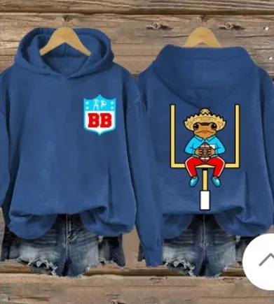 Sport this vibrant blue graphic hoodie and feel the playful spirit of the game. The front proudly displays a shield emblem with 'BB' inside, representing Bad Bunny's initials. Turn around to reveal an eye-catching illustration of a Coqui from Puerto Rico dressed in a pava, sitting on a goalpost and holding a football, ready to make a play. This hoodie offers a relaxed fit, perfect for staying cozy whether you're cheering from the sidelines or running errands. Style: Pullover Department: Unisex Adults Type: Hoodie Closure: Pullover Theme: Letters, Numbers & Words, Safari Features: Hooded, Double-Sided Character: Betty Boop Fabric Type: Knit Pattern: Solid Material: Cotton Blend Accents: Logo Sleeve Length: Long Sleeve Neckline: Crew Neck Performance/Activity: Football Keywords: graphic hoodie, frog graphic, football theme, casual wear, streetwear, comfortable, pullover, long sleeve, winter apparel, winter fashion, fall fashion, sporty, unique design
