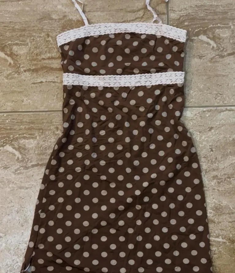Vintage Beija Brazil brown and white polka dot mini dress with lace trim and bow - $38 - From Brooke