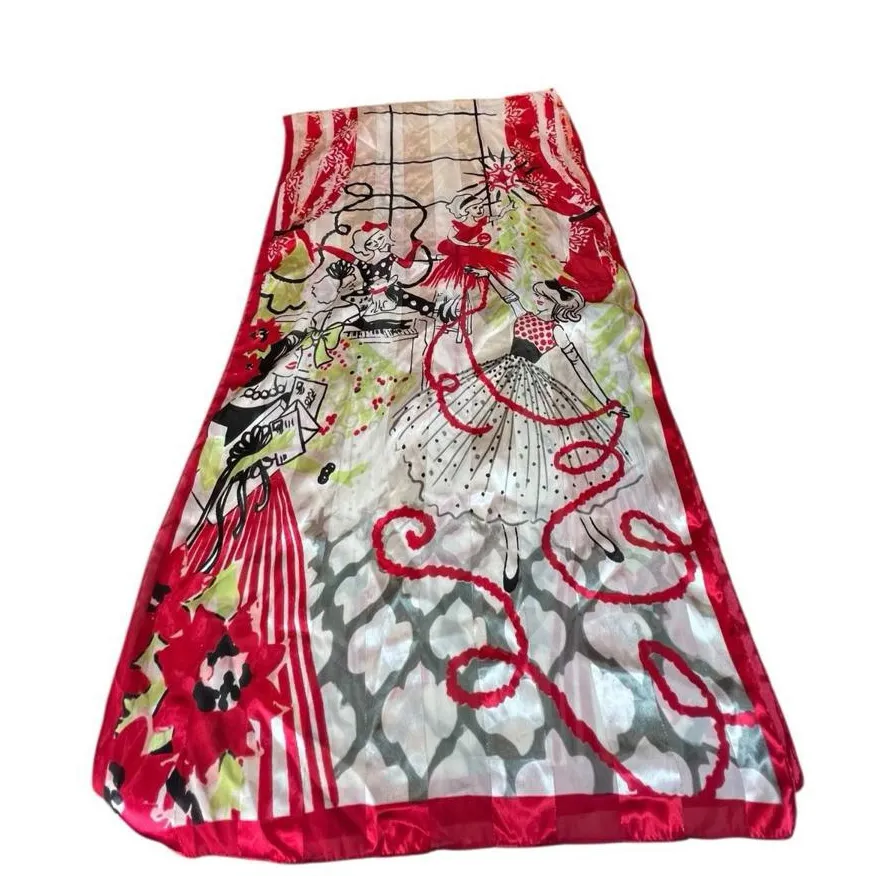 This scarf features a vibrant, kitschy Christmas theme with a retro 1950s rockabilly dance party illustration. The playful novelty print, in festive red, white, black, and green, showcases women in full skirts, some near a piano and a decorated tree. Measuring a large 68" x 20", the satiny fabric (likely a silk blend) makes it a statement accessory perfect for holiday parties or adding a touch of nostalgia to any outfit. In excellent pre-owned condition with the specified dimensions, this piece aligns with current 2025 resale trends where vintage fashion and unique statement accessories are in high demand. The eye-catching graphic print and specific era appeal attract eco-conscious Gen Z and millennial buyers seeking one-of-a-kind, sustainable finds. Dimensions: Generous 68" x 20" oblong/rectangle shape #rockabilly #christmasdecor #sustainablefashion #statementaccessoryl
