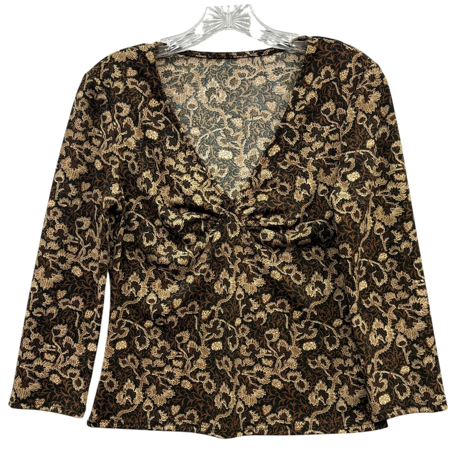 Retro Y2k Edgy Floral Print Long Sleeve Top Gathered V Neck Blouse Gently Used- No Size or Brand tag Elegant floral blouse with a stylish twist. This long-sleeve top features a sophisticated floral pattern in brown and gold tones over a black background. The blouse showcases a flattering V-neckline and a unique gathered front design that accentuates the waist. Its elegant and comfortable design makes it a versatile addition to any wardrobe, suitable for both casual and dressy occasions. Size Small Approximate Measurements: 21" Length 18" Pit To Pit 19" Sleeve Length Floral, Elegant, Romantic, Vintage, Long Sleeve, Fitted, Textured, Chic, Feminine, Ruched Feel Free To Ask Questions Or Request More Photos! SKU:0120