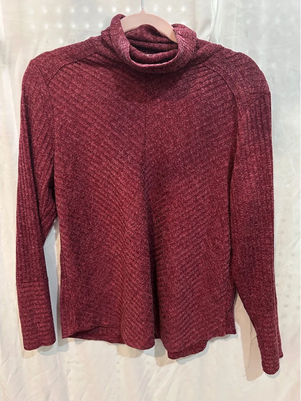Burgundy ribbed turtleneck long sleeve sweater top. This stylish top offers a flattering fit with its textured ribbing and comfortable turtleneck design. Perfect for layering or wearing on its own, it's a versatile addition to any wardrobe. Ideal for casual outings, office wear, or a cozy evening at home. Style: Pullover Department: Women Neckline: Turtleneck Type: Sweater Sleeve Length: Long Sleeve Features: Stretch Pattern: Geometric Fabric Type: Knit - I ship in 1-2 days. - The more you bundle, the more free items you get! - Shop my closet for: jeans, workout, athletic, shoes, career, resort, vacation, swim, fall, work, lounge, cashmere, chic, boho and brands such as: Nike, Athleta, Torrid, Knox Rose, Anthropologie, Lulu, For Love, Entro, LOFT, Lilly