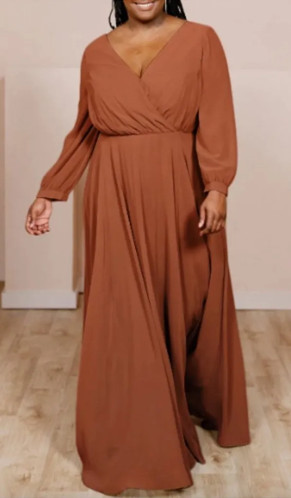 *A run on the back, a few marks on the front A perfect option for your fall and winter weddings with her beautiful sheer long sleeves, our Juliet Chiffon dress provides all the romance to wrap up your wedding day look! Juliet features a faux-wrap top with a cinched waist that transitions into a flowing full chiffon skirt providing modest coverage, and an overall flattering fit Flowing A-line silhouette V-neckline Built-in bra cups and vertical boning for support Long sleeves Back zipper Full-length double lining for extra coverage