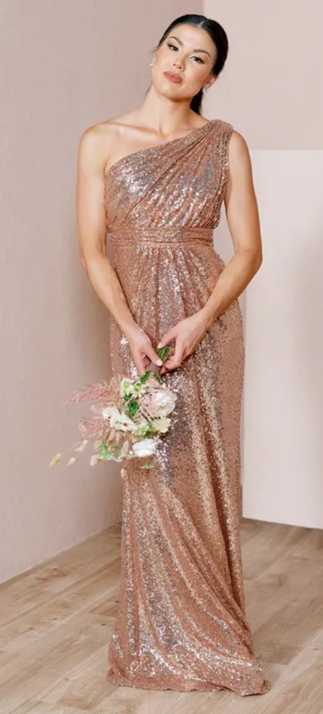 REVELRY Starla Rose Gold Sequin One Shoulder Maxi Gown Dress 10 Pink - $86 - From Cari